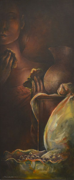 L’olio dorato e pane bruscato arrivano alla gola, lubrificano il gargarozzo e purificano l’anima. L’occhio, allo stesso modo, mangia e assapora, si delizia nel colore e nella forma di pane e olio, che si fondono sulla linguetta impertinente.